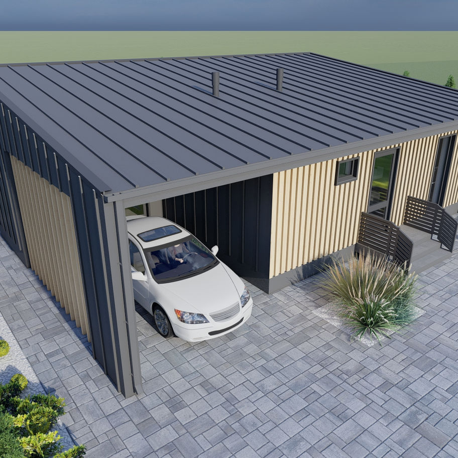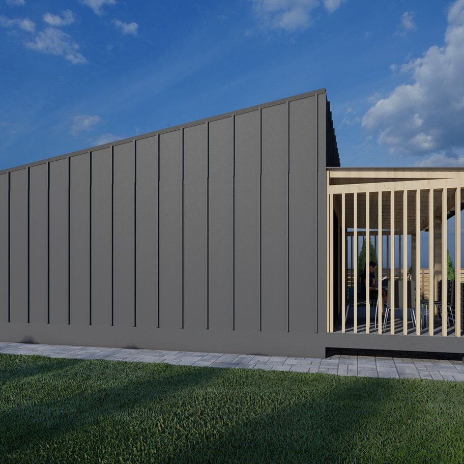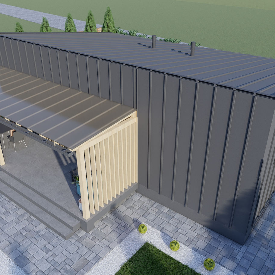 Одноповерховий будинок з односхилим дахом, максимально продуманим плануванням і можливістю використання як житлового простору, так і міні-готелю. В центрі — просторий open space, по боках — ізольовані зони, технічні приміщення та навіть кімната для обладнання з рекуператором.